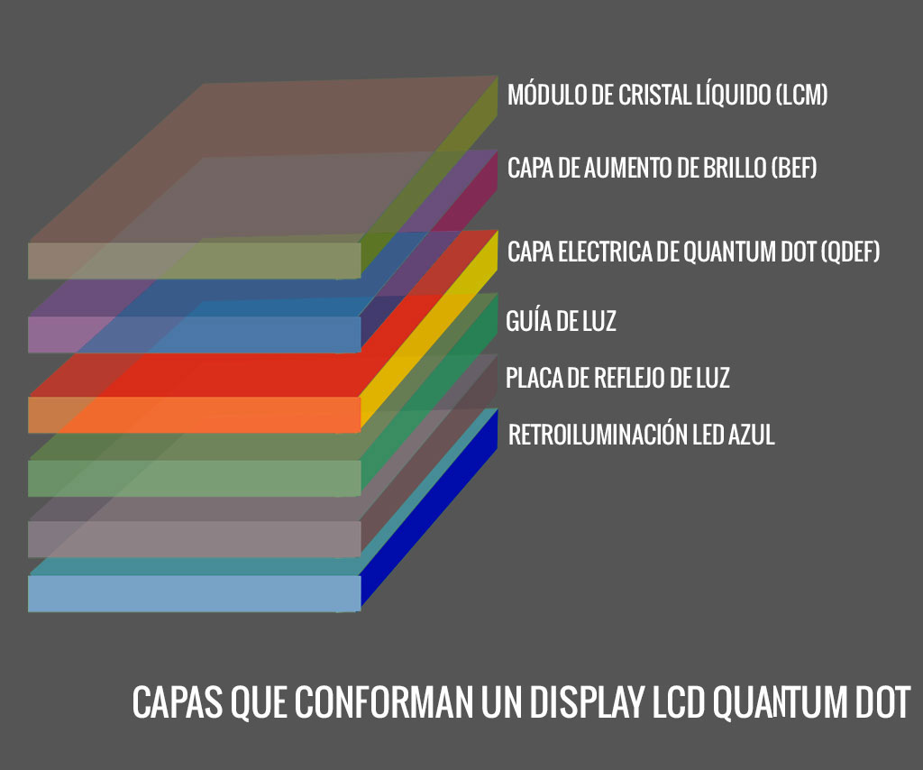 Como menciona Wired, la principal diferencia entre ese sándwich y el de QD es que el último tiene retroiluminación de LED azul. Esta luz azul pasa por una guía de luz que pasa por los nanocristales de Quantum Dot. Estos cristales refractan la luz y amplían su longitud de onda para crear el color rojo y el verde. Este cambio de color ocurre por el cambio de tamaño de los cristales de la capa QD: como explica Trusted Reviews, los cristales más pequeños van a tender al verde y cristales más grandes al rojo. Este proceso permite colores mucho más saturados, más puros (capaces de producir un espectro de color más amplio hasta el blanco más puro) y le quita capas al sándwich tradicional.