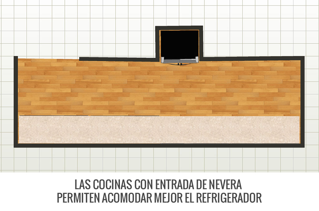 En algunos apartamentos y casas hay una cabina o una entrada sobre la pared en la que se coloca la nevera. En estos casos es preferible tener en cuenta el ancho de la nevera para que quepa sin rayarse. La cabina le ayuda con la profundidad y le permite comprar una nevera más barrigona sin que obstruya el paso en la cocina.