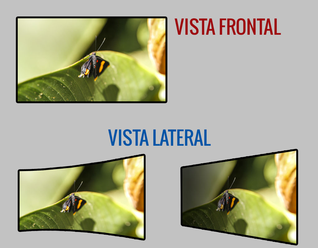 Con las pantallas curvas la distorsión es mucho más leve, y esto ayuda a que la imagen no tenga la perdida de color que se produce en las pantallas planas. La visión lateral mejora mucho y deja que las personas que se sientan a los lados puedan disfrutar el contenido como quien está sentado al frente. Así mismo, quien está centrado aprovecha más el ángulo de visión de la imagen que al verla en un televisor de pantalla plana.