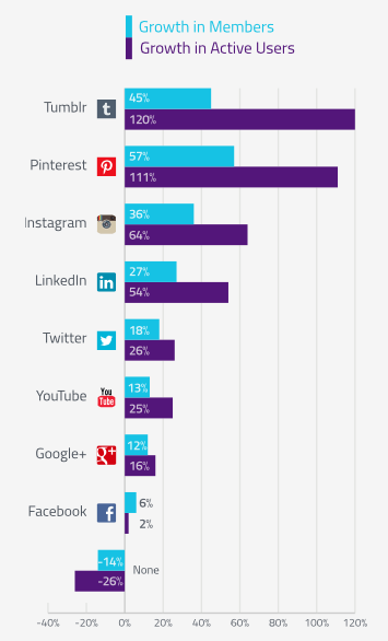 Según la investigación, en los últimos seis meses, la base de usuarios activos en Tumblr creció un 120%, mientras que Facebook solo creció un 2%. También son buenas noticias noticias para Pinterest, que aumentó su número de usuarios en un 57%, y de usuarios activos en un 111%.