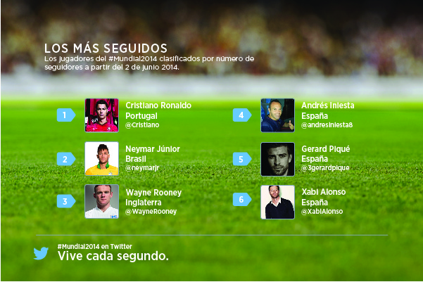 Si quieren seguir el Mundial en la red social, los hashtags oficiales son: #WorldCup, #Brazil2014 y #Mundial2014. Algunas de las cuentas oficiales para seguir segundo a segundo todas las noticias de este evento son: @FifaWorldCup, @Fifacom, @Brazuca o @Maracana.