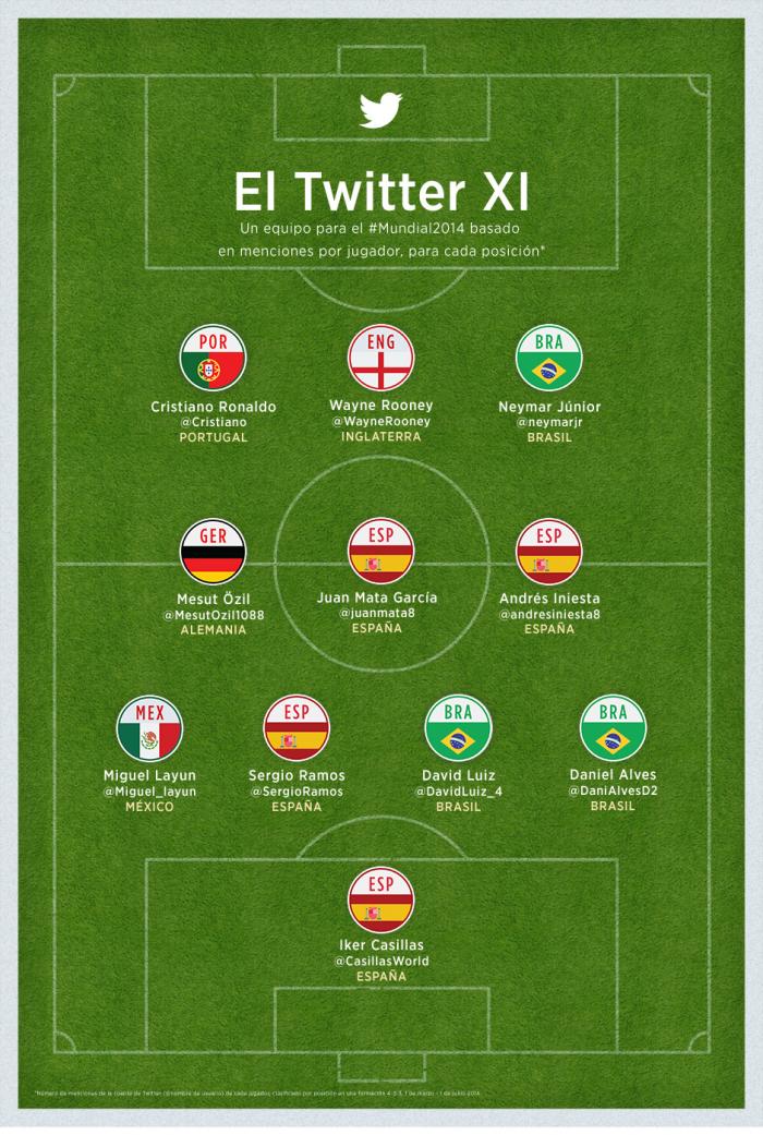 En primer lugar, Twitter nos cuenta que esta Copa Mundial ha generado muchos más tuits que la de 2010. Además, la red social se encargó de reunir su propia selección y la llamó El Twitter XI. Está basada en menciones por jugador para cada posición. Así quedará: