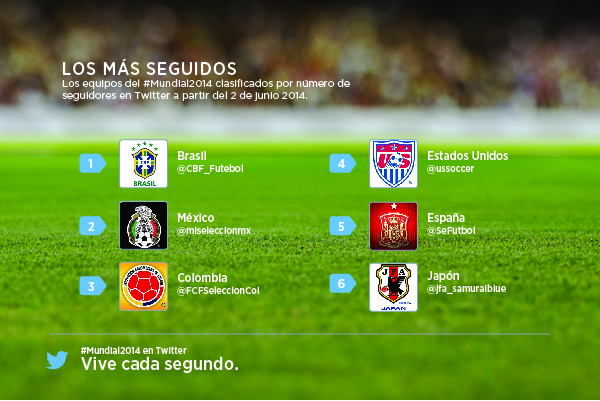 También reunió las selecciones con mayor número de seguidores. Si quieren saber la lista de las selecciones en Twitter, pueden verla aquí. Acá les dejamos el top seis de aquellas con mayor número de seguidores. Colombia está en tercer lugar.