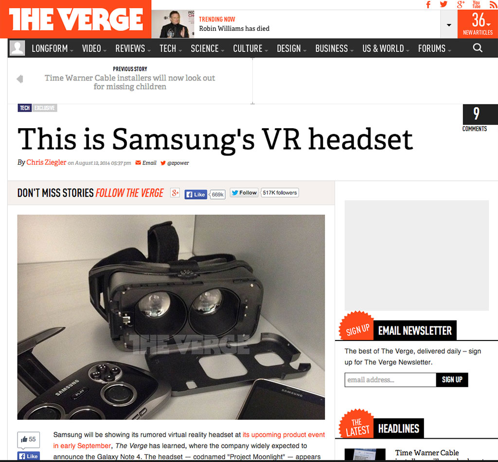 Según lo que reporta The Verge, la surcoreana mostrará el casco de realidad virtual en su próxima conferencia a comienzos de septiembre en IFA. Su estructura es similar al cardboard de Google, con la diferencia de que se ve como una carcaza de plástico, que además tendrá un ajuste de dioptría y un puerto microUSB. El medio estadounidense aclara que en esa imágen el set está acompañado por un Samsung Galaxy S5, pero teniendo en cuenta que el Note 4 está próximo a salir, lo más probable es que será compatible con la nueva pantalla grande de Samsung.