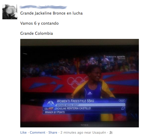 ¡Tercer bronce para Colombia en los Olímpicos de Londres! Esta vez se trata de Jackeline Rentería, que derrotó a su contrincante en lucha por el bronce. Con esta sumamos un total de 6 medallas en los Olímpicos, y con Mariana Pajón mantenemos la expectativa de rematar por una medalla de oro.
