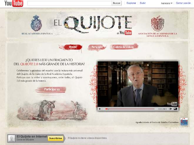 3. Quijote 2.0. Una de las obras maestras de la literatura tendrá pronto una versión hablada por miles de personas de todo el planeta, en un proyecto colaborativo liderado por la Real Academia de la Lengua Española y que se ha denominado Quijote 2.0. Los usuarios del sitio de videos YouTube tienen que ingresar al sitio de la iniciativa, registrarse con su nombre de usuario y contraseña de YouTube, y solicitar un fragmento del texto. La persona tendrá entonces que leer y grabar, en un plazo de 6 horas, el texto asignado. Si transcurrido este tiempo no lo ha subido, se reasignará a otro usuario.