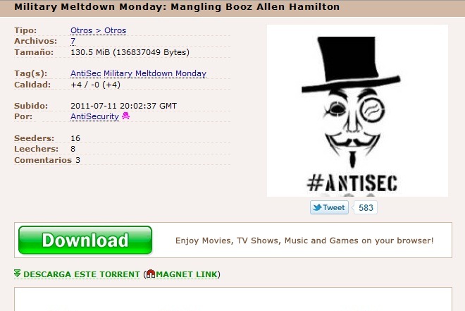 En la página de la descripción del archivo, Anonymous señala que logró infiltrarse de manera muy fácil a los servidores de Booz Allen Hamilton, una firma consultora con gran presencia como contratista de entidades gubernamentales y militares de Estados Unidos, cuyo trabajo principal se centra en la defensa y seguridad nacional y en los programas de ayuda militar de este país.