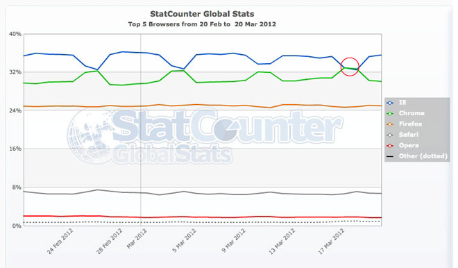 El ascenso en la popularidad de Chrome parece inatajable. Celebró su tercer cumpleaños en septiembre del año pasado alcanzando el 22% de la cuota de mercado, y cada día gana más adeptos. Pero el 18 de marzo ocurrió algo inédito. Ese día, según cálculos de Statcounter, el navegador de Google fue, por primera vez, el más usado en el mundo.