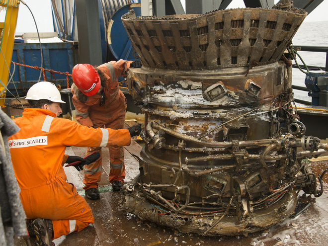 Bezos anunció que la tarea se ha completado al sacar a flote los cohetes. “Hemos visto una maravilla submarina – una increíble escultura de motores F-1 retorcidos que cuentan la historia de un final intenso y violento, uno que sirve como testamento al programa Apolo”, dijo en su blog.