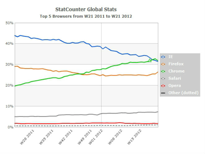 Aunque en marzo de 2012, Google Chrome fue el navegador más usado por un día, Mashable informó que Chrome acaba de superar a Internet Explorer y se ha convertido en el preferido de los usuarios alrededor del mundo. Según cifras de Statcounter, la última semana fue la primera vez que Chrome ocupó el lugar número uno durante un periodo de tiempo sostenido.