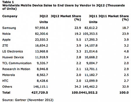 En su informe del tercer trimestre que refleja las cifras de la industria de la telefonía móvil, Gartner mostró que Samsung sigue siendo el líder indiscutible del mercado a nivel mundial, después de obtener un aumento del 18% de sus ventas en este periodo y alcanzar casi los 98 millones de teléfonos vendidos. De hecho, recordemos que el Samsung Galaxy S III se convirtió en el teléfono más vendido a nivel mundial en el tercer trimestre de 2012.
