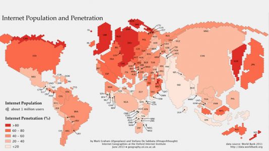 Este mapa fue diseñado por el departamento de geografía Instituto de Internet de Oxford y retrata la manera en la que está distribuida la población del mundo según si...
