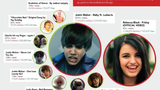 En el listado el artista que más producciones tiene es Justin Bieber. A juzgar por el número de visitas, los videos no solo son odiados, sino también muy populares.