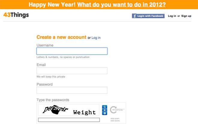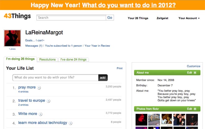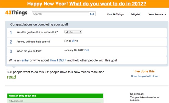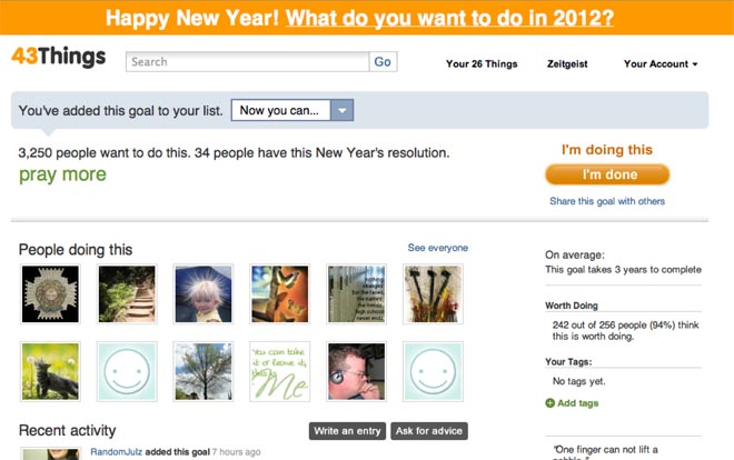 Si llega a aficionarse –algo más probable si tiene la aplicación móvil–, puede convertir a 43Things en una red social para usted: la interacción con otras personas enriquecerá la experiencia y lo motivará aún más para tener el mejor 2012 de su vida.