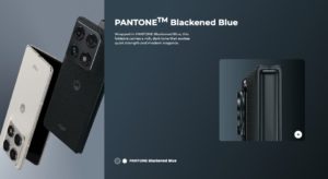 Sobre el diseño, el equipo estará disponible en los colores Pantone Lily White y Pantone Blackened Blue. Las imágenes difundidas por la marca muestran una sección trasera texturizada cerca del módulo de cámaras. Este acabado mejora el agarre al sostener el equipo en posición horizontal.