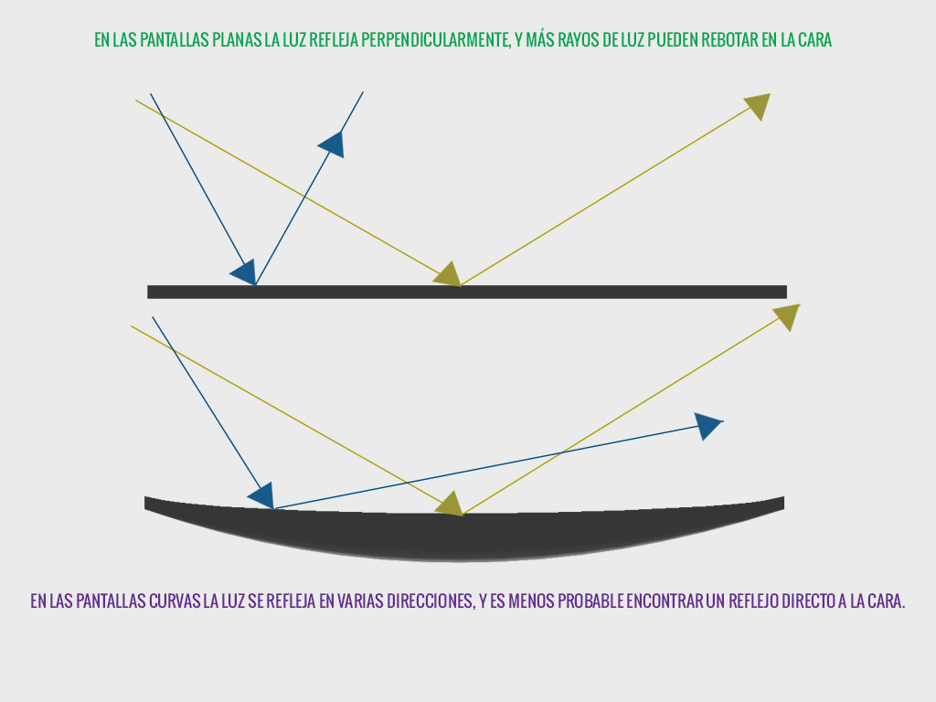 Estas consisten en los reflejos de la pantalla, la contaminación de la luz y la falta de ‘privacidad de proyección’. La curvatura de las nuevas pantallas aprovechan efectos ópticos producidos por la forma cóncava del dispositivo para mejorar estos elementos.