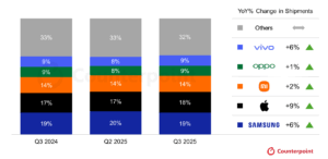 En India, los envíos aumentaron 9% interanual, impulsados por las compras de temporada festiva, los programas de financiamiento y la rápida adopción de teléfonos 5G asequibles. Japón, por su parte, creció 15%, sostenido por la fuerte demanda de los iPhone 16 y 16e. En MEA, el avance fue del 14%, con Samsung y Xiaomi dominando los segmentos de gama media y premium.