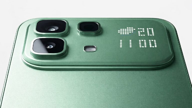 En el Note 60 Pro, Infinix refuerza la apuesta por el diseño con una isla de cámaras rectangular y una pantalla secundaria integrada en el módulo trasero. La compañía denomina a esta interfaz Active Matrix Display, un sistema de iluminación mini-LED que permite consultar notificaciones, hora, clima y nivel de batería sin activar la pantalla principal.