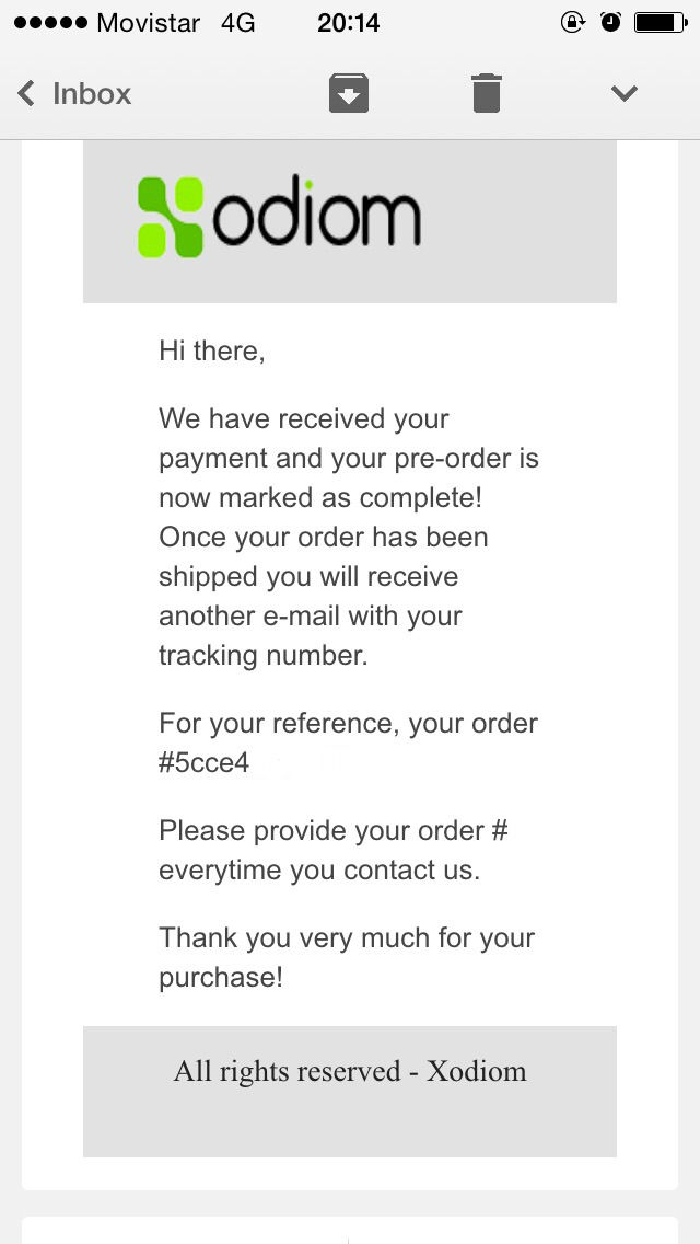 Estuvimos haciendo una prueba para comprar el equipo, y llenamos los datos en el formulario de pago, escogimos la opción ‘pagar con Bitcoins’ (sin tener una cuenta ni billetera electrónica). Posterior a eso, nos llegó el siguiente mensaje: “Hola, ¡hemos recibido su pago y su preorden está completa! Una vez su orden haya sido despachada usted recibirá otro correo electrónico con un número de seguimiento. Para su referencia, su número de orden es #XXX. Por favor proporcione su número de orden cada vez que nos contacte. Gracias por su compra”.